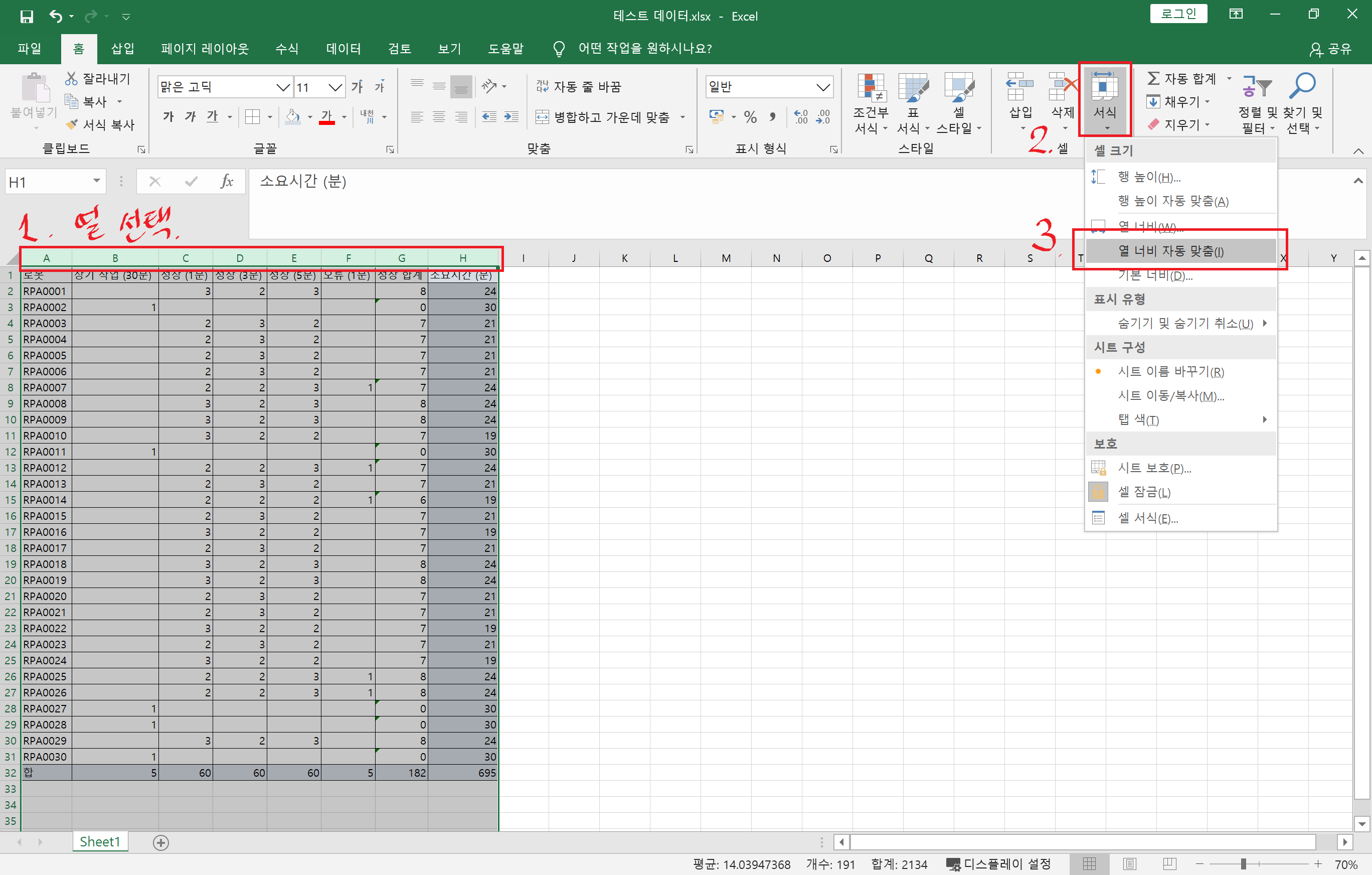 먼저 요구 받은 로봇 별 작업 횟수를 파악한 데이터를 선택해 열 너비 자동 맞춤을 진행했습니다.