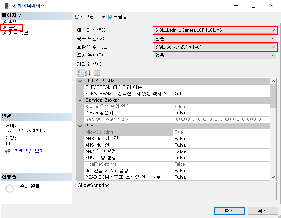 데이터 정렬 및 호환성 수준을 설정해 줍니다. 제가 이전에 사용하던 버전까지는 호환성을 맞추고자 호환성 수준은 2019가 아닌 한 단계 낮은 SQL Server 2017을 선택했습니다.
