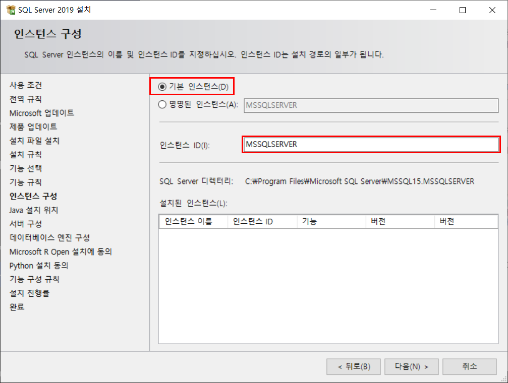 서버 인스턴스의 이름을 지정할 수 있습니다. 저는 기본 인스턴스 옵션으로 변경을 하였는데 정확히 기억은 나지 않지만, 기본값은 명명된 인스턴스 옵션으로 선택되어있고, 이름이 Express블라블라였던 것 같습니다.