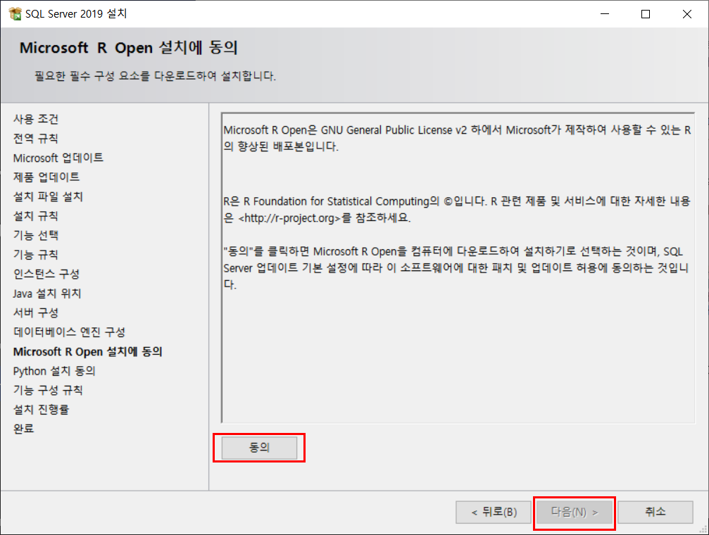 동의를 하고 다음으로 넘어갑니다. MS에서 만든 향상된 배포본의 R을 업데이트하는데 동의할 것인지를 물어보네요. 역시나 동의를 하지 않을 수 없으므로... 동의합니다.