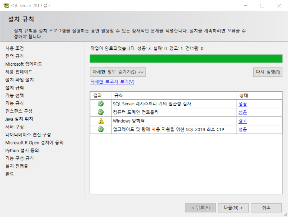 설명과 같이 설치 시 발생할 수 있는 문제를 확인하여 알려주거나 경고, 실패(Error)와 같이 알려주는 화면으로 보입니다.