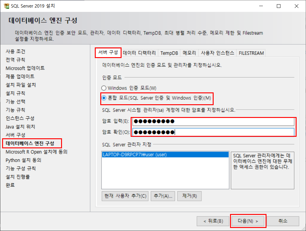 서버 구성 tab에서 인증모드는 혼합 모드로 설정을 해 둡니다. Windows 인증 모드만 쓸 이유가 없습니다. 그리고 혼합모드로 하여 sa계정까지 한 번에 설정할 수 있습니다. sa계정은 DB를 다룰 수 있는 가장 강력한 로그인이므로 반드시 암호를 잊지 않도록 해야 합니다.